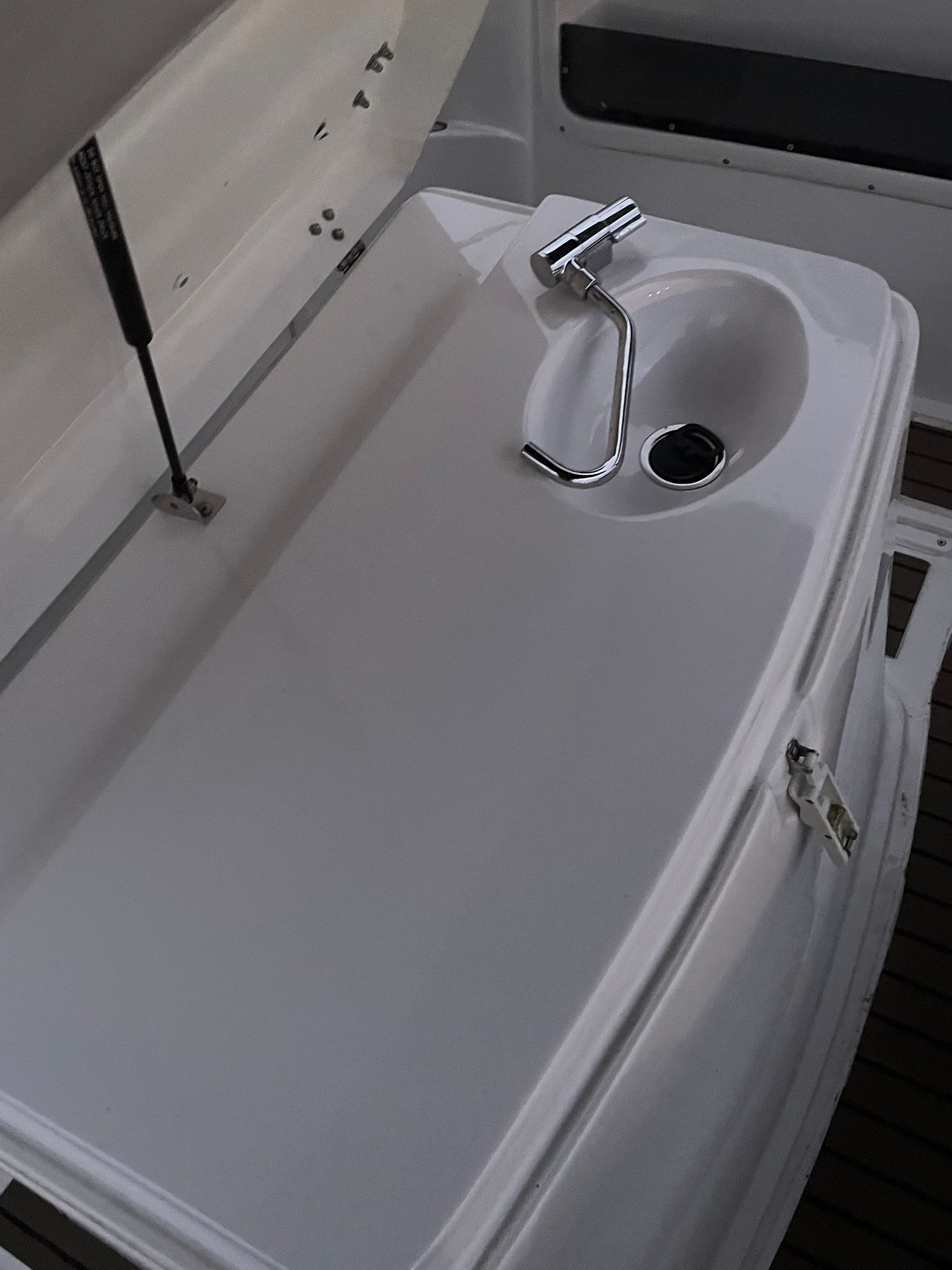 Boot besitzt eine Toilette auf dem Boot (Bordtoilette) funktioniert mit elektrische Pumpe und spült mit Meerwasser, wobei Fäkalien in einen Fäkalientank geleitet werden